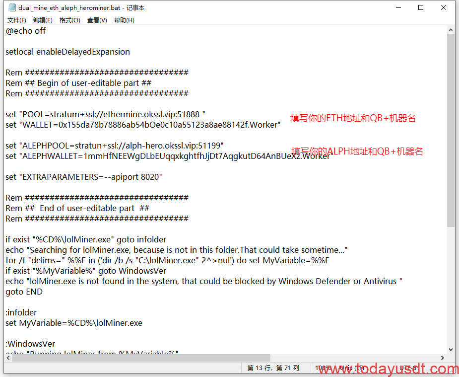 右键编辑打开名为有etc_aleph_herominer.bat或者ethw_aleph_herominer.bat(挖ethf也是这个文件)的文件,填写如下参数以ETC+ZIL+ALPH为例: